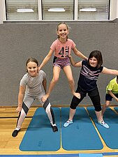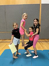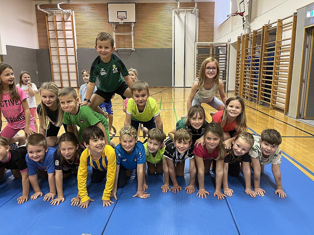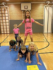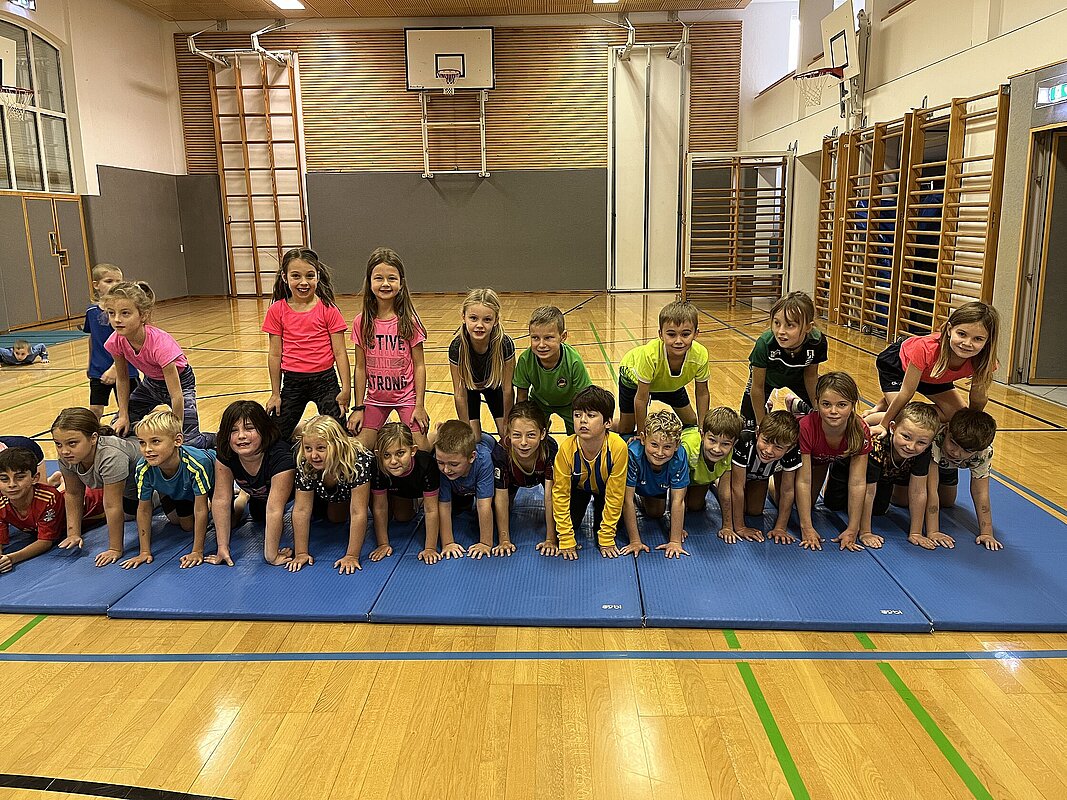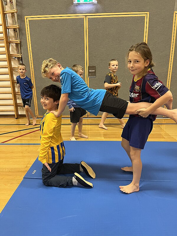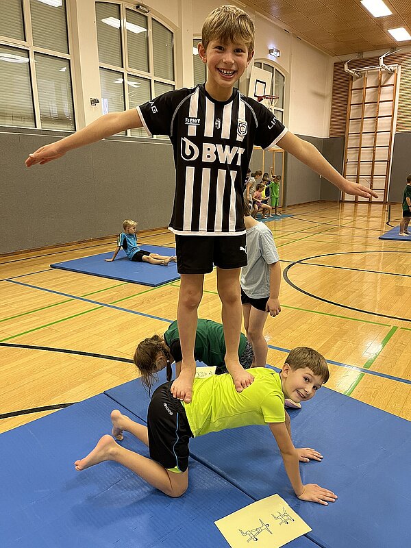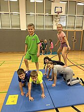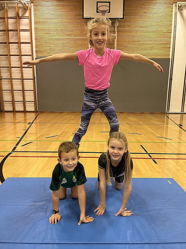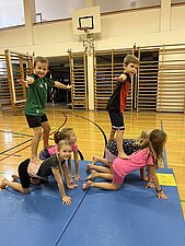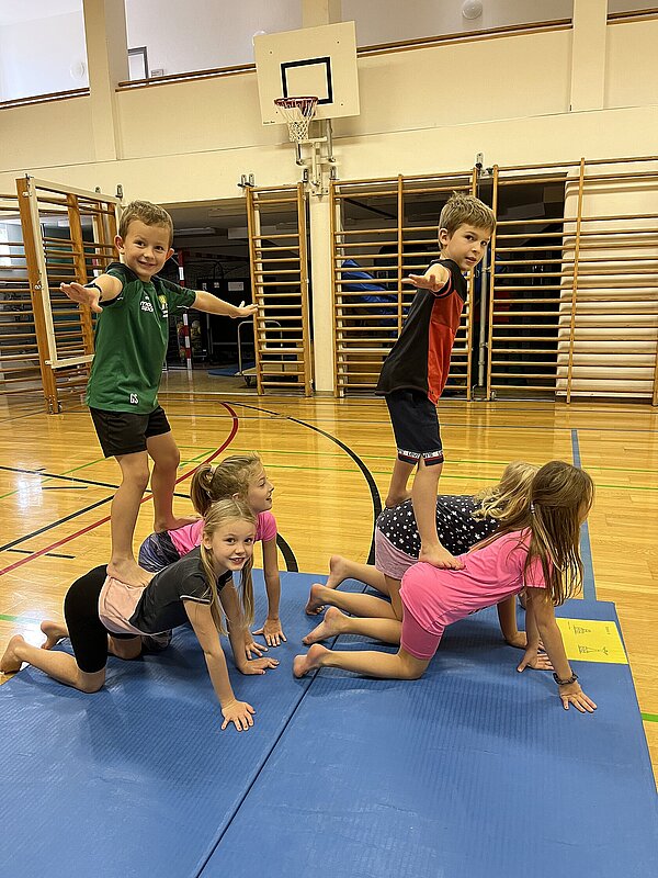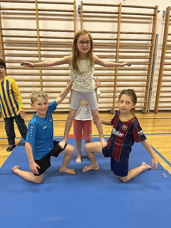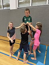 Die 2. und 3. Klasse versuchten im Turnunterricht verschiedene Menschenpyramiden und Partnerakrobatik-Übungen aus. Zum Schluss gelang einigen Kindern noch eine große Pyramide!