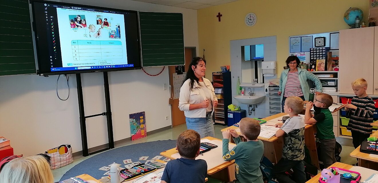 Passend zum Sachunterrichts-Thema “Berufe in der Schule” besuchten Frau Direktorin Georgine Wagner und unsere Schulwartin Eva Weberberger die 2. Klasse. Die Fragen der Schülerinnen und Schüler waren vielfältig: Wofür ist eine Direktorin in der Schule verantwortlich? Was sind die Aufgaben der Schulwartin? Mit großem Interesse verfolgten sie die Antworten der beiden Besucherinnen.