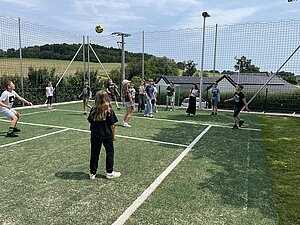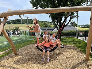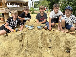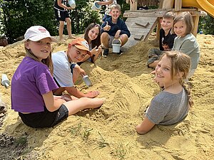 Viele Pausen und auch so manche Turnstunde verbringen wir in diesen Tagen auf unserem tollen neuen Spielplatz. Die Kinder sind begeistert vom Kunstrasenplatz, die Nestschaukel ist besonders beliebt, aber auch die Sandmulde wird viel bespielt.