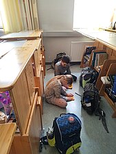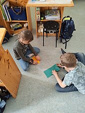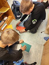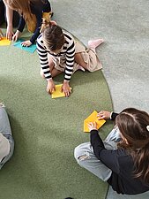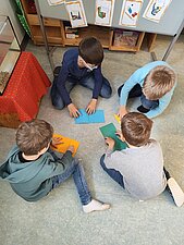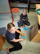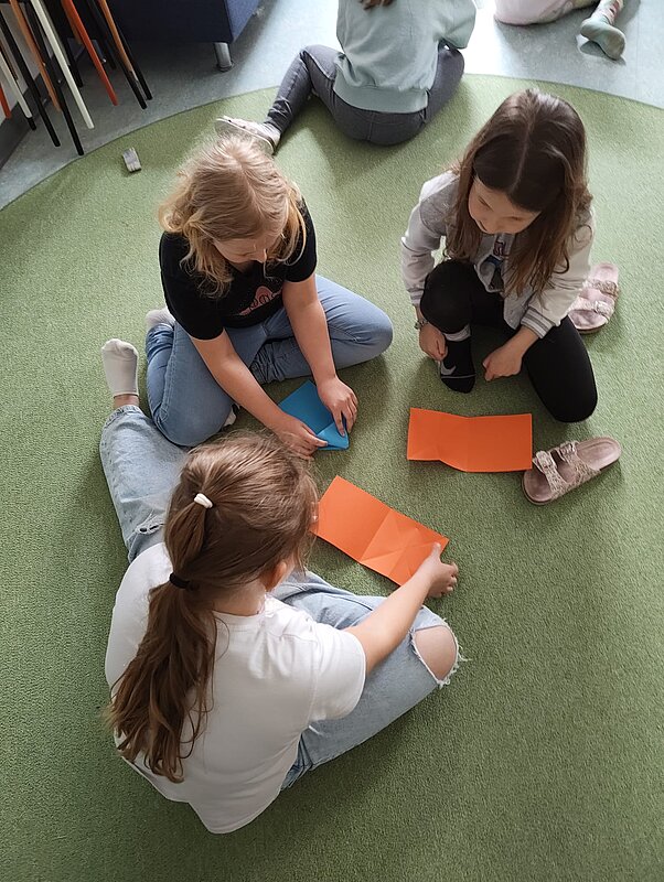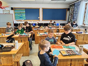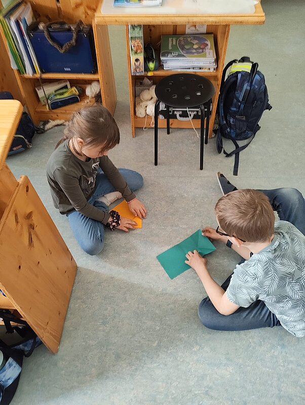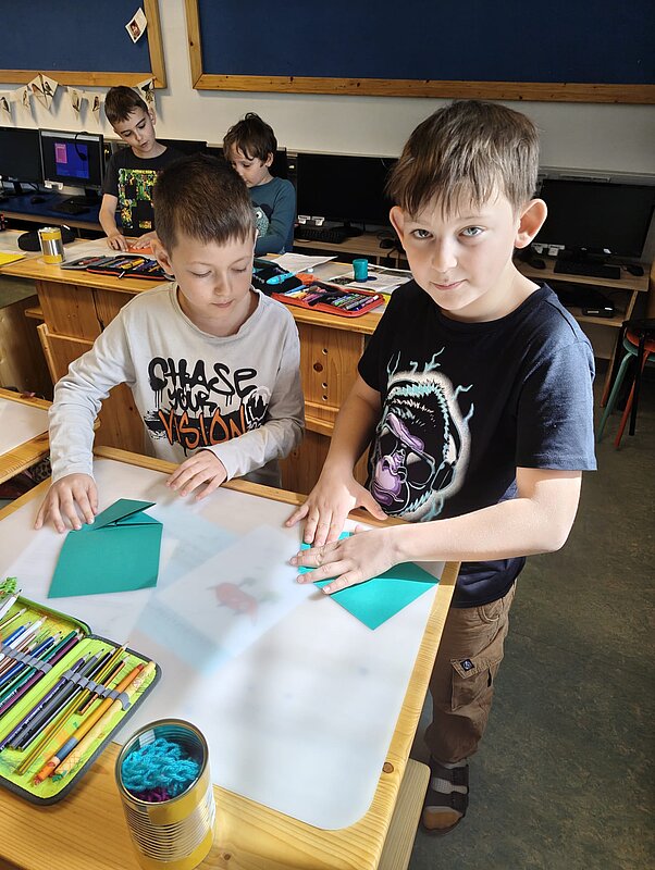 Heute arbeiteten die 2. und 4. Klasse in zwei Einheiten zusammen. Die 4. Klasse erklärte den Jüngeren das Fingerhäkeln und die 2. Klasse zeigte den Älteren die Froschfaltung.