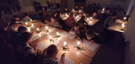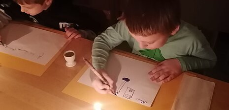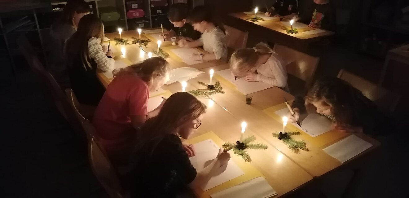 Heute erlebte die 2. Klasse, wie es früher in der Schule war. Sie schrieben und gestalteten ihre Weihnachtskarten mit Rohrfeder und Tinte bei Kerzenschein!