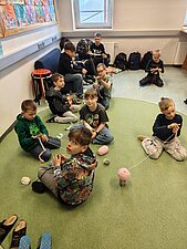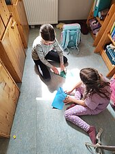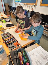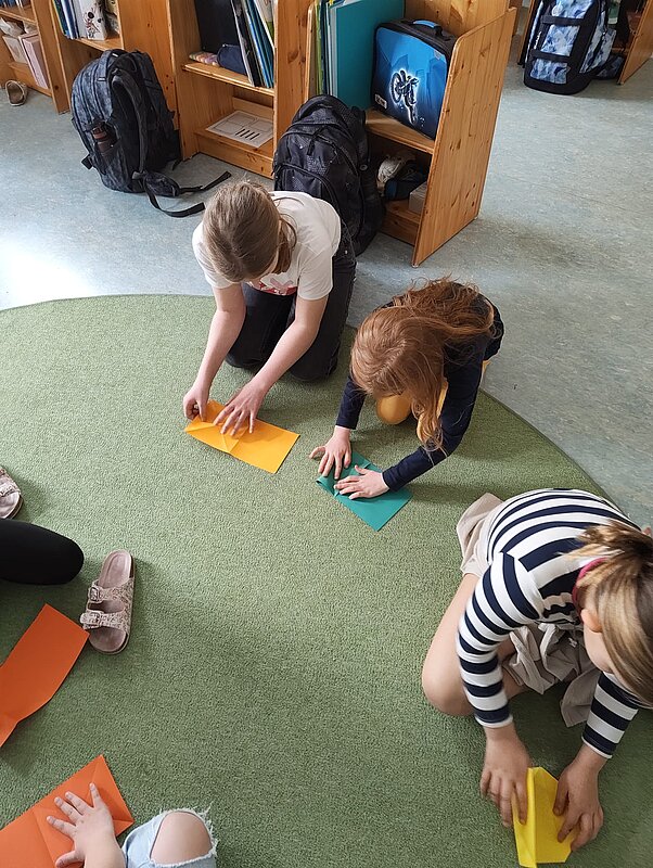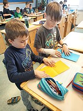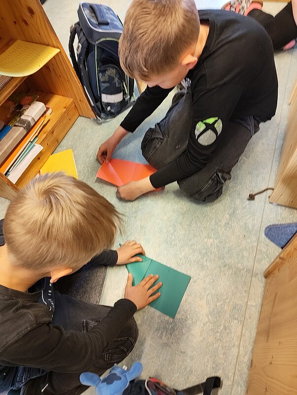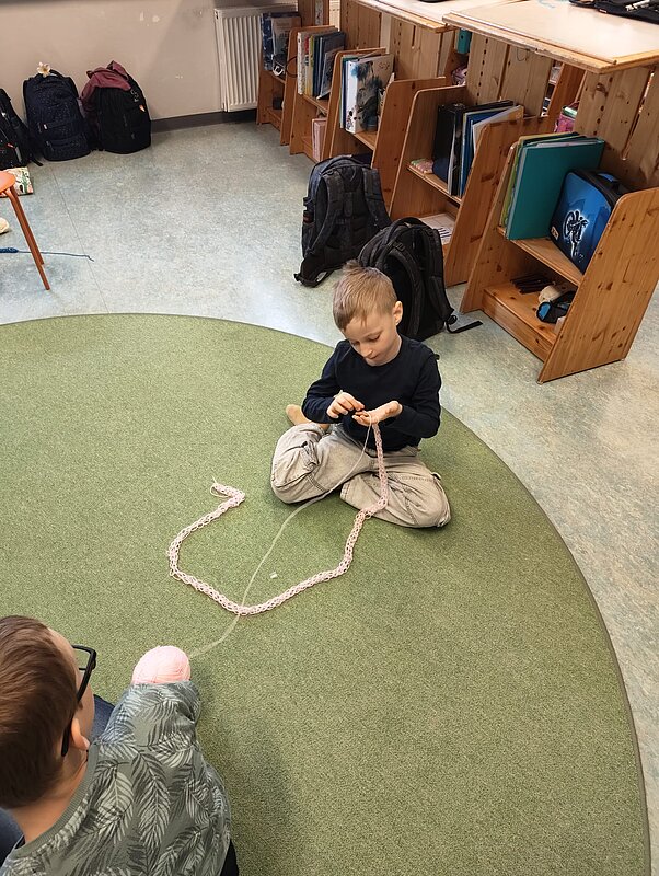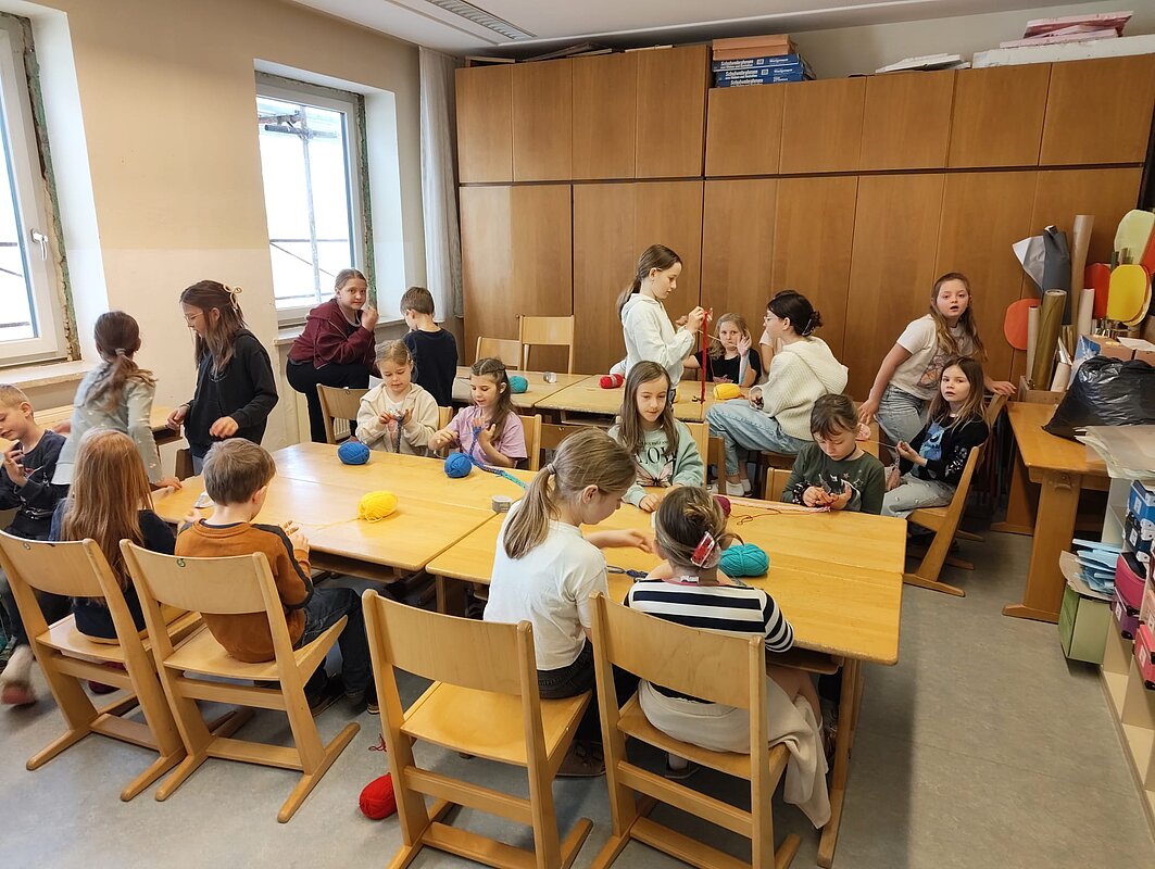 Heute arbeiteten die 2. und 4. Klasse in zwei Einheiten zusammen. Die 4. Klasse erklärte den Jüngeren das Fingerhäkeln und die 2. Klasse zeigte den Älteren die Froschfaltung.